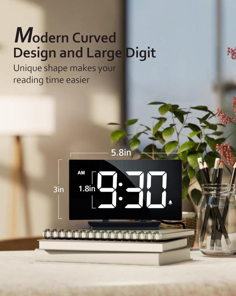- ⏰ 【Large Display & Multi-function】Digital alarm clock with large LED display (6.3″x0.7~1″x2.36″), which lets you check the time clearly at a glance even it is far from you. Our desk clock with 5 mode: clock mode, date mode, DST mode, night mode (ON/OFF), alarm mode. The buttons on the rear are very self explanatory, so it is very easy to set up! The “colon” between the hour and minute display fixed non-flashing.