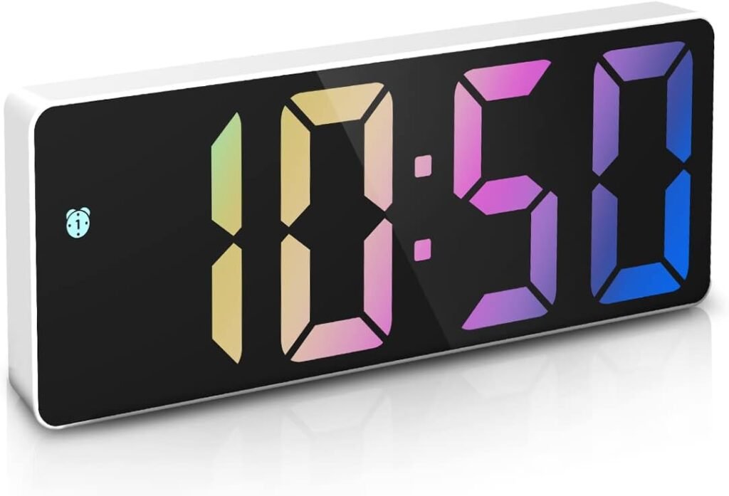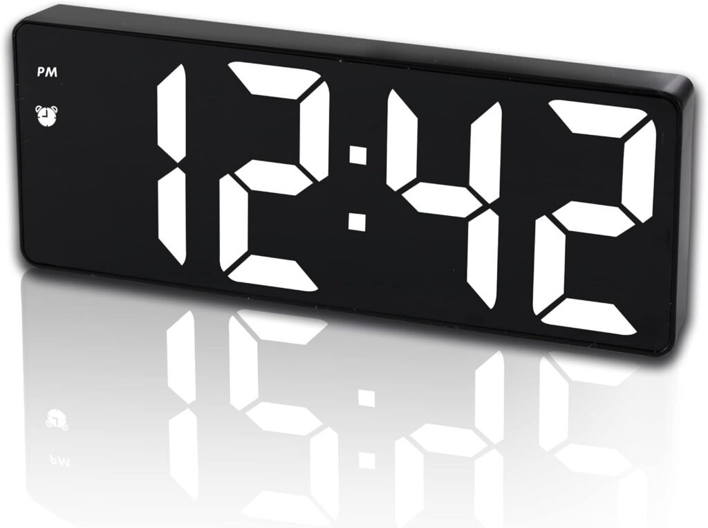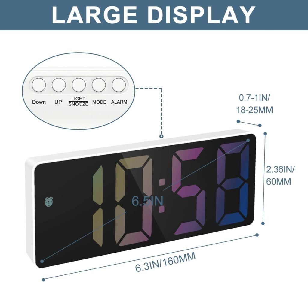- ⏰ 【Large Display & Multi-function】Digital alarm clock with large LED display (6.3″x0.7~1″x2.36″), which lets you check the time clearly at a glance even it is far from you. Our desk clock with 5 mode: clock mode, date mode, temperature mode, night mode (ON/OFF), alarm mode. The buttons on the rear are very self explanatory, so it is very easy to set up! The “colon” between the hour and minute display flashes continuously